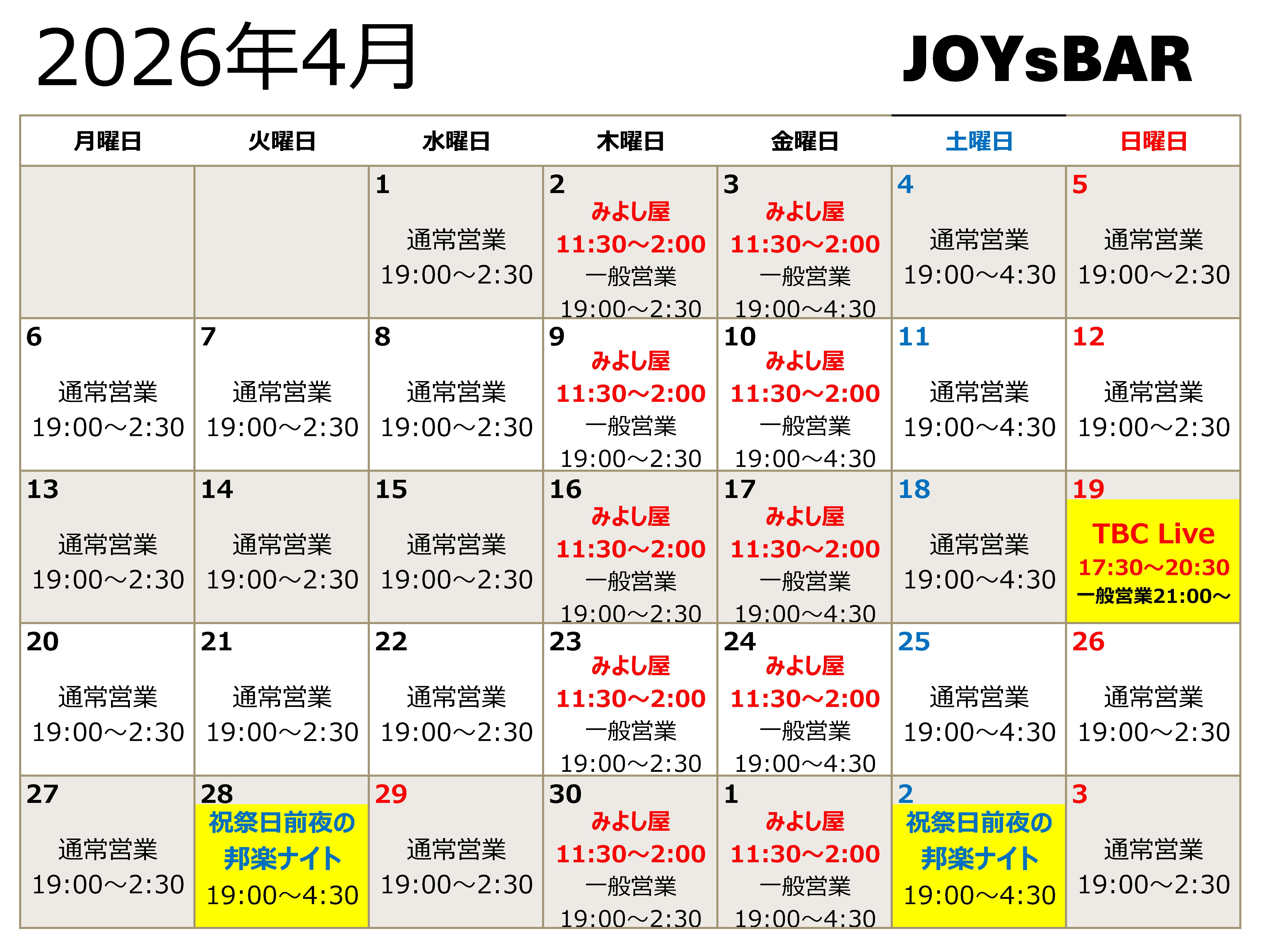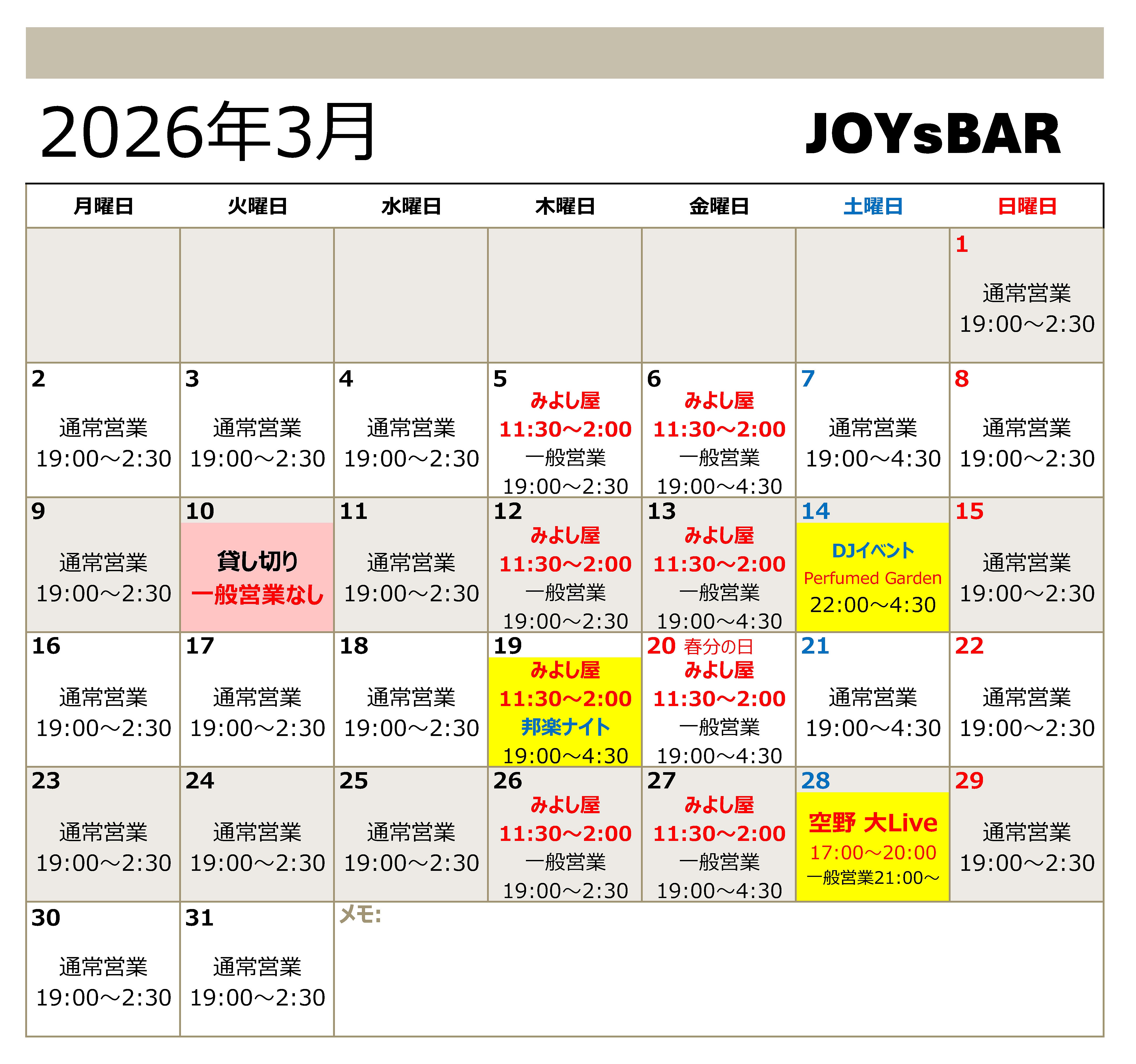 2026/3 JOYsBAR 営業カレンダー