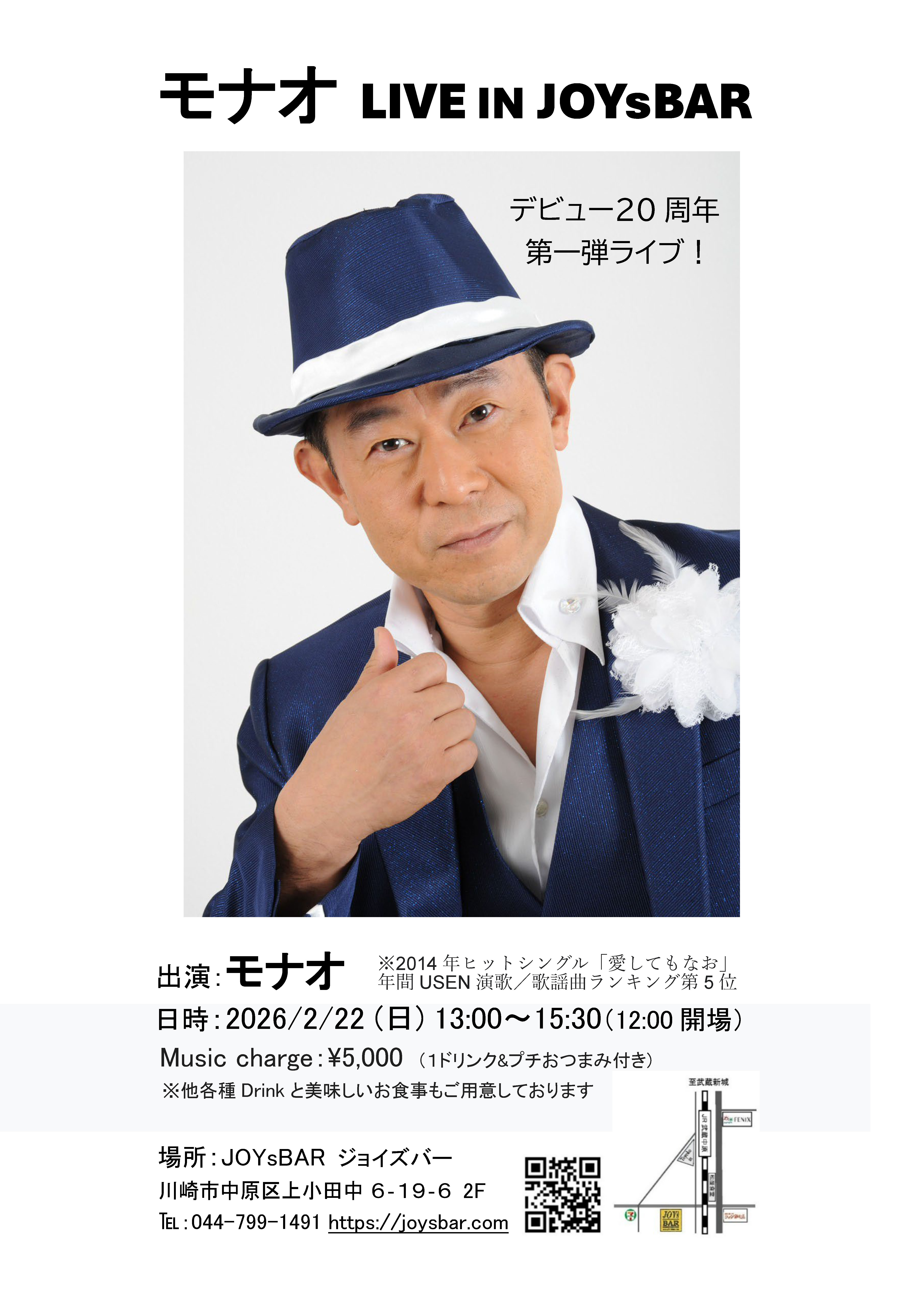 モナオ LIVE in JOYsBAR 【出演】モナオ Open12:00 ライブ スタート 13:00~ ミュージックチャージ¥5000 1ドリンク&プチおつまみ付き |